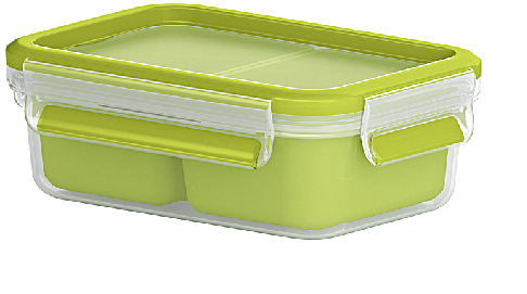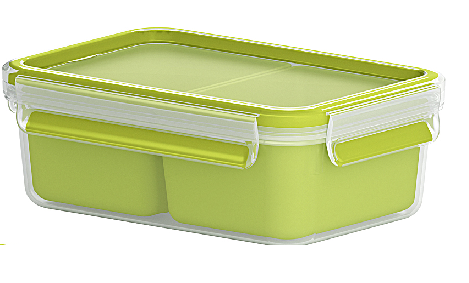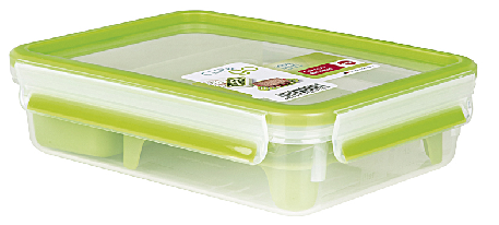 Die Brunchbox Clip & Go von EMSA ist rechteckig und fasst 1,2 l. Sie hat einen Gittereinsatz für zwei Ebenen sowie einen extra Einsatz für Snacks wie beispielsweise Gemüsesticks. Die Dose ist 100% dicht und kann selbst flüssige Lebensmittel transportieren. Das eingespritzte Gummi besteht aus thermoplastischen Elastomeren und der Deckel mit grünem Rand, sowie das transparente Unterteil bestehen aus Kunststoff. Die Maße der Brunchbox beträgt 22,5x 16,3x 5,8 cm.