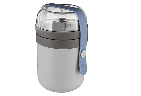 Die BPA freie Mehrzweckdose Leo von BERGHOFF empfiehlt sich, wenn Sie Essen mit zur Arbeit nehmen möchten. Sie besteht aus Kunststoff und Silikon und ist ideal für kleine Mahlzeiten. Die Dose besteht aus 2 Behältern, die durch einen Deckel voneinander getrennt sind. Somit können Sie Speisen getrennt voneinander aufbewahren. Die Dose ist auslaufsicher und man kann die Behälter problemlos aufeinander stecken. Das Silikonband macht sie transportsicher. Sie können die Lunchdosen problemlos in der Spülmaschine reinigen. Das Fassungsvermögen beträgt 470 ml + 180 ml. In der Farbe grau mit blauem Silikonband passt die Lunchdose optisch überall hin. Die Maße beträgt 9,5x 9,5x 15,5 cm.
