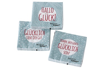 Das Picknick ist organisiert und jetzt fehlen nur noch die passenden Servietten? Da können wir Ihnen helfen. Auf den Zelltuchservietten "Glück" von BOLTZE sind viele schöne Sprüche, die Ihnen und Ihren Freunden ein Lächeln ins Gesicht zaubern. Mit der blauen Farbe und pinker Schrift sind die Servietten ein echter Hingucker.